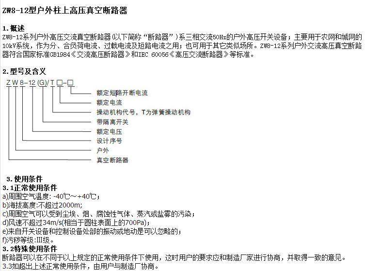 ZW8-12系列户外高压交流电真空断路器(以下简称“断路器”)是一种三相交流50hz的户外高压开关装置;它主要用以城乡电网的10kv系统中,作为分合闸负载电流,过载电流和短路电流的一种。它也可以在其他相近的地方采用。ZW8-12系列户外交流高压真空断路器符合国家标准GB1984“交流高压断路器”和IEC 60056“高压交流断路器”等基准。